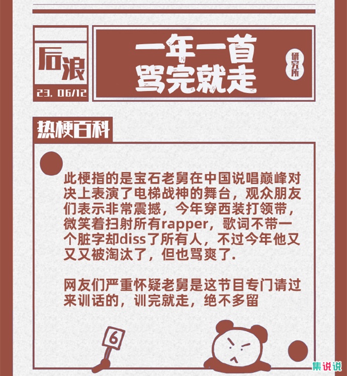 1、此梗指的是宝石老舅在中国说唱巅峰对决上表演了电梯战神的舞台,观众朋友们表示非常震撼,今年穿西装打领带,微笑着扫射所有rapper,歌词不带一个脏字却diss了所有人,不过今年他又又又被淘汰了,但也骂爽了