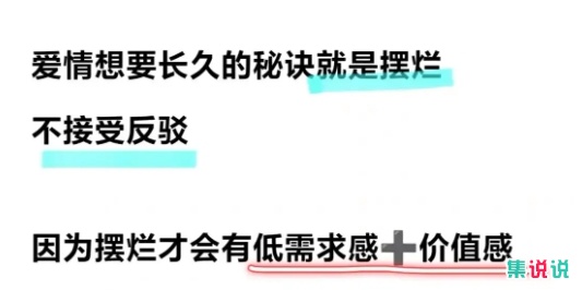 摆烂式爱情,指的是高度“自由”的爱情,它指的是一种不负责任、不用心、没有付出的爱情,不主动追求,抱着无所谓的态度,能处就处,不能处就拉到,面对别人的追求,会觉得还是算了一个人就好。抑或是明知这段感情有问题,还是任由它继续下去。也有另外一种意思是那种看似漫不经心,不太在意对方,但实际上却非常关心对方,不离不弃的爱情。