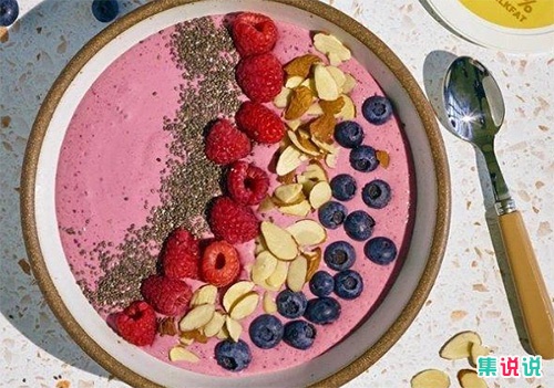 4、在酸奶表面点缀树莓、蓝莓、干果、燕麦、黑巧克力等食材。