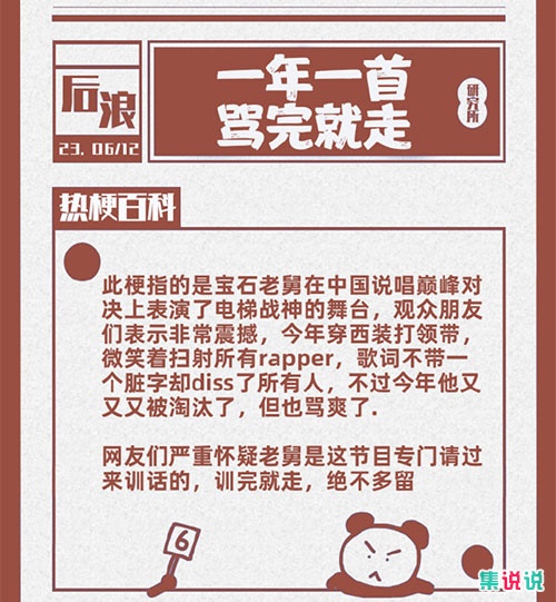 “一年一首骂完就走”源自宝石老舅在中国说唱巅峰对决的惊艳表现——电梯战神舞台。他身着西装革履,面带微笑,以歌词为刃,不吐脏字却犀利地“扫射”全场rapper,展现了高超的说唱技艺与独特的diss风格。尽管再次遗憾离场,但其霸气侧漏的演出已足够让观众大呼过瘾,直呼“骂得够爽”!