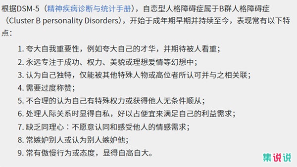 根据DSM-5(精神障碍诊断与统计手册),NPD属于B型人格障碍,以下九种特点是NPD常见表现:
