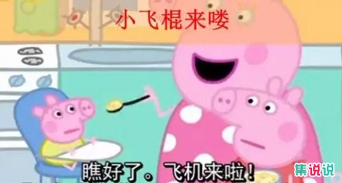 小飞棍来咯源自于一个国外家长哄小孩吃饭的一个小技巧。当小孩不想吃饭时,家长就会模仿小猪佩奇动画片中的一个场景。