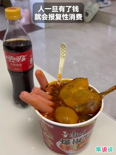 这个梗是最近网友们的抽象“炫富”行为,别人展示实力都是豪车别野,而当代网友就比较接地气了。一碗泡面都能吃出豪横的感觉,主打一个实现火腿肠、卤蛋自由。