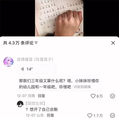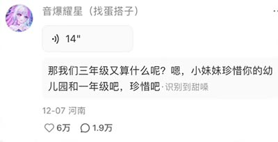 她将一年级语文的第一课《秋天》划掉,改成了三年级语文的第一课《大青树下的小学》,希望通过这种方式让自己“长大”,结果就引来了一位神人网友“音爆耀星”留下了这样一段语音评论:“那我们三年级又算什么呢?嗯,小妹妹珍惜你的幼儿园和一年级吧,珍惜吧。”