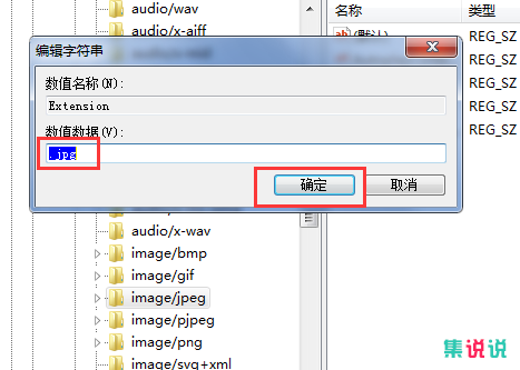 3、打开编辑字符串窗口后,数值数据内改为“.jpg”,点击“确定”,关闭注册表。
