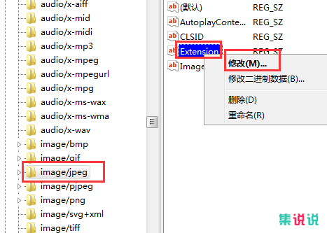 2、找到路径“HKEY_CLASSES_ROOT\MIME\Database\Content Type\image/jpeg”,右键点击右边“Extension”,菜单内点击“修改”。
